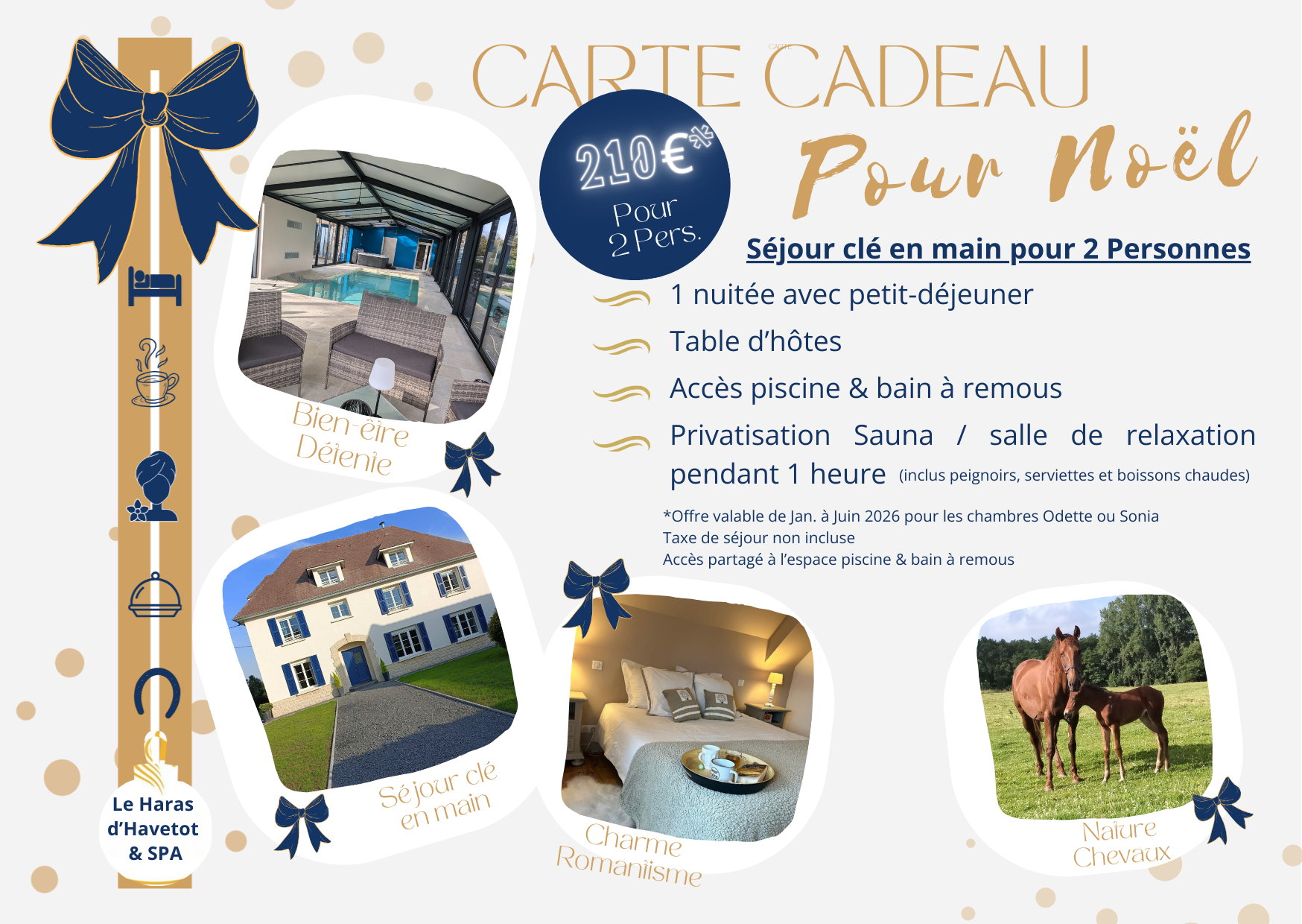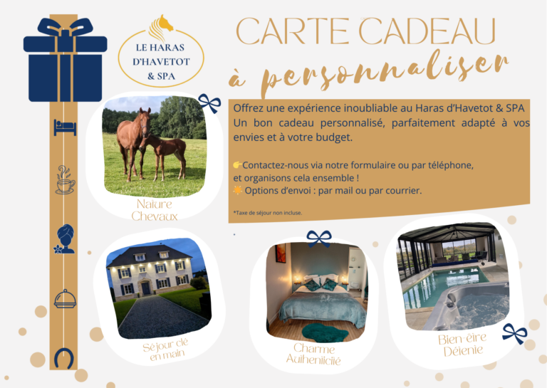 Offrez une expérience inoubliable au Haras d’Havetot & SPA : un bon cadeau personnalisé, créé selon vos envies et votre budget, pour faire plaisir en toute occasion